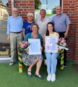 Ohne sie läuft nichts: Der Kreissportbund Wesel (KSB) hat am vergangenen Freitag, 4. Juli 2025 zwei herausragende Persönlichkeiten aus der Schermbecker Sportlandschaft für ihr freiwilliges Engagement ausgezeichnet. In den Räumen der „TANZakademie Schermbeck“ überreichte KSB-Vorsitzender Gustav Hensel die Preise „Ehrenamt“ und „Junges Ehrenamt“ an Ulrike Pollmann und Jana Stenzel. Mit dabei waren Vertreterinnen und Vertreter des Tanzclubs Grün-Weiß Schermbeck e.V. und der Vorsitzende des Gemeindesportverbands Schermbeck, Hans Kutscher.
